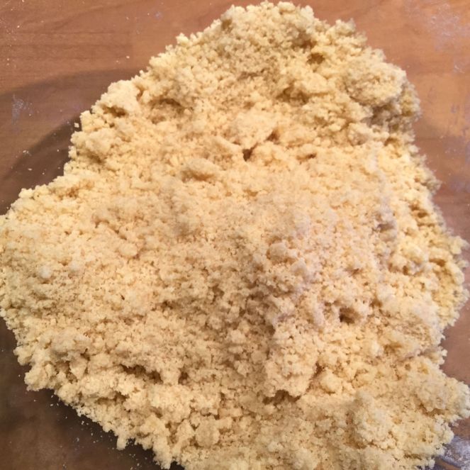 On procède donc par sablage ce qui veut dire qu’on mélange la farine, le sucre (si c’est la version sucrée) et le beurre ensemble jusqu’à obtenir une consistance sableuse.