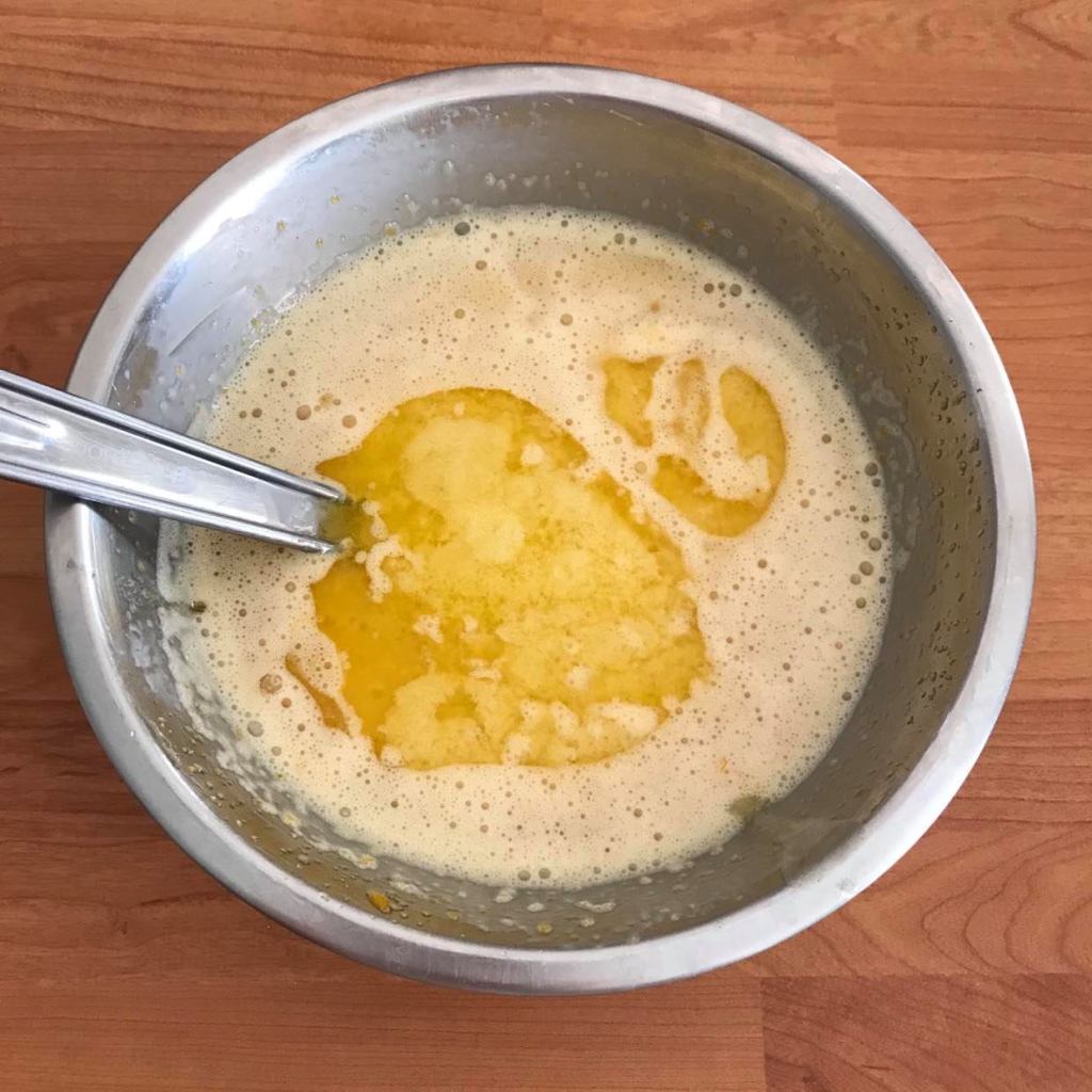 Incorporez l’autre moitié du beurre fondu (60 g) et mélangez à nouveau jusqu’à obtenir une pâte bien lisse et homogène.