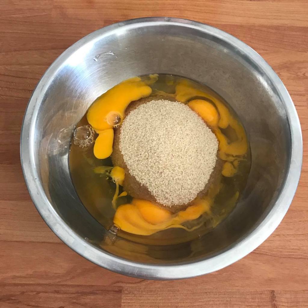Ensuite, fouettez les 4 œufs avec les 190 g de sucre roux. Faites blanchir le tout.