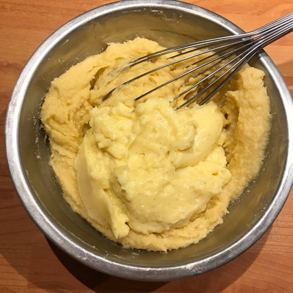 Une fois le mélange bien crémeux, versez en deux ou trois fois les 110 g d’œufs pour éviter au mélange de trancher. Mélangez jusqu’à ce que le tout soit homogène.