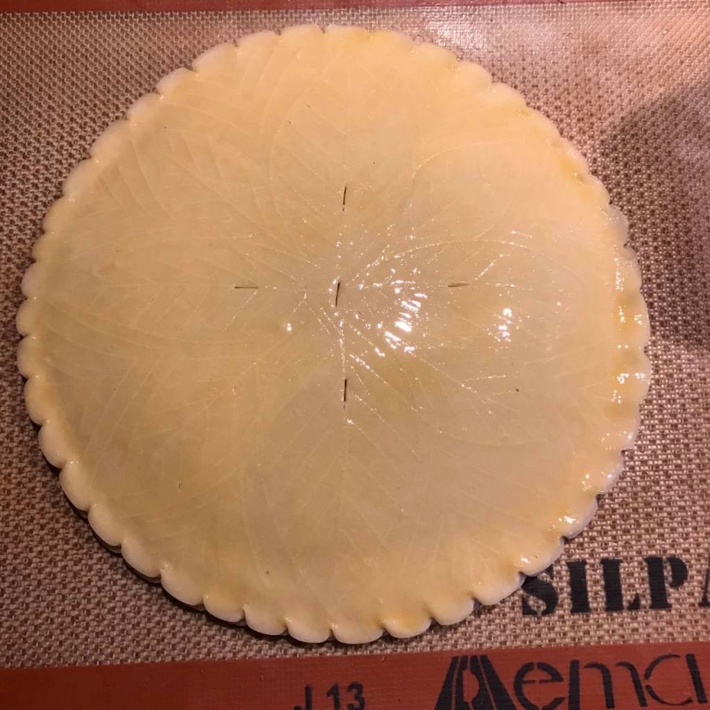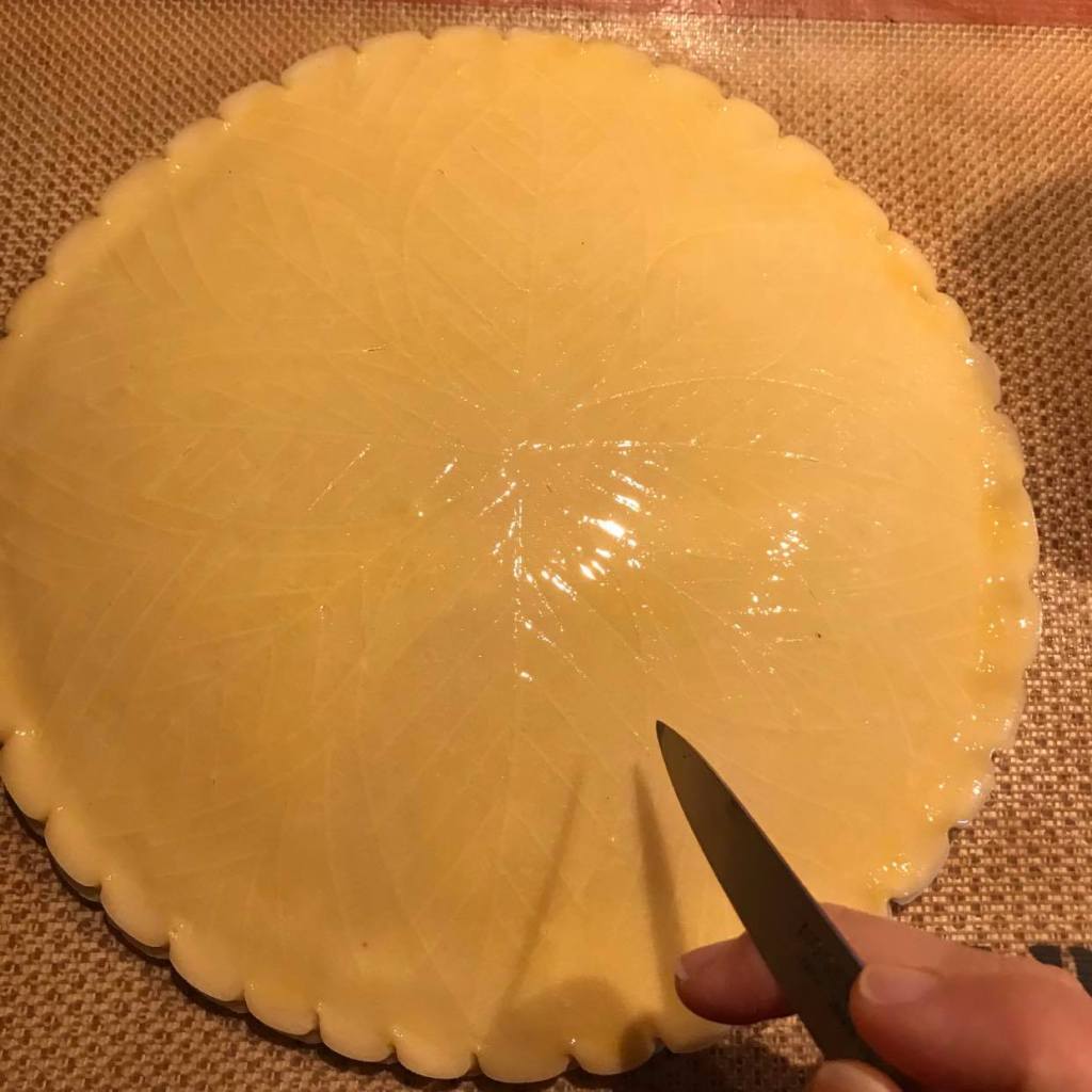 Il ne vous restera plus qu’à la dorer (1 oeuf et 5 cl de crème), la décorer et la chiqueter c’est-à-dire faire les petites entailles sur le coté.