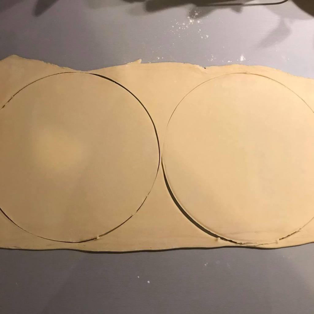 Pour le montage, il faut abaisser la pâte et détailler deux cercles de pâte un de 20 cm et un de 22 cm. Aidez vous d’un cercle à pâtisserie et n’écrasez pas la pâte pour conserver le feuilletage.