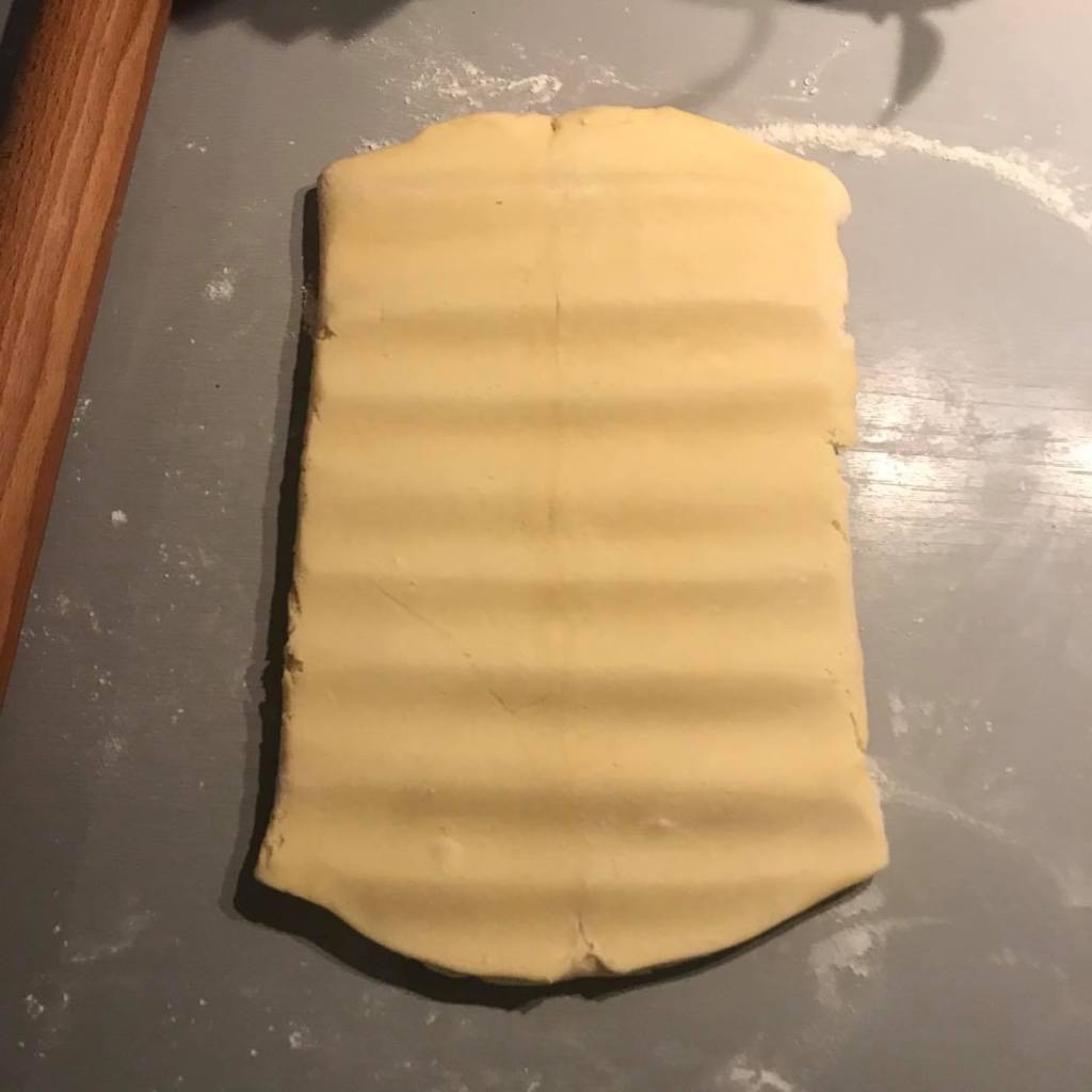 Commencez par appuyer avec le rouleau tout au long de la pâte puis abaissez. Je vous conseille de regarder le live du chef ici.