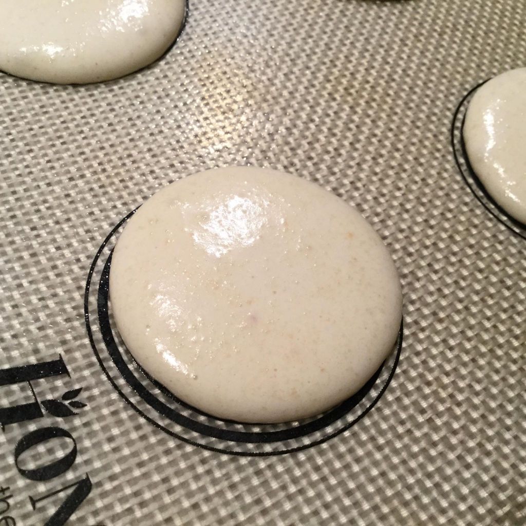 Une fois la pâte prête, garnissez une poche à douille munie d’une douille de 10 et pochez vos macarons. Mettez votre douille bien parallèle à la plaque pour pocher.