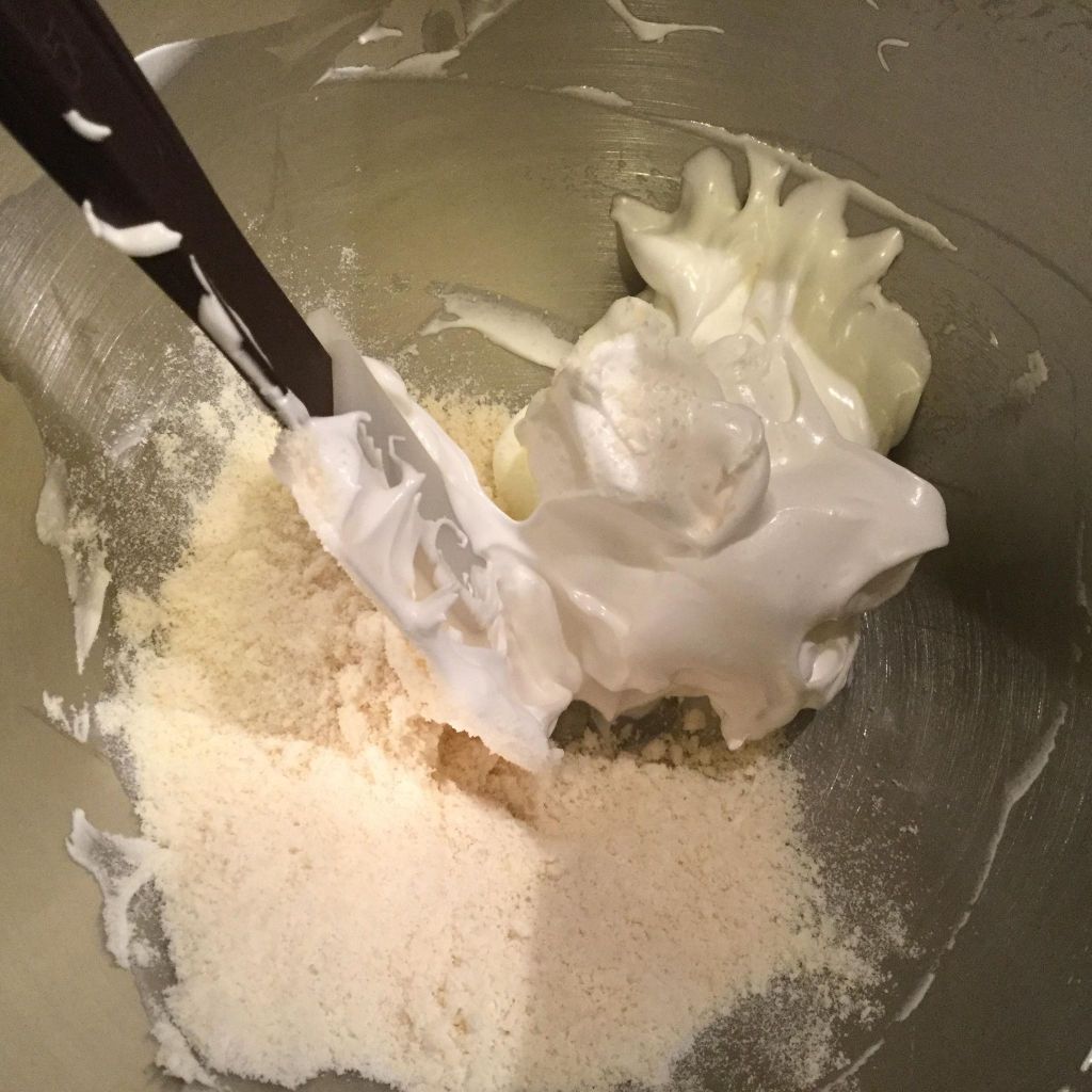 Prenez une petite partie et mélangez-la au premier mélange (poudre amande/sucre glace et blancs d’oeufs). Ensuite, incorporez le reste de la meringue italienne à la maryse .