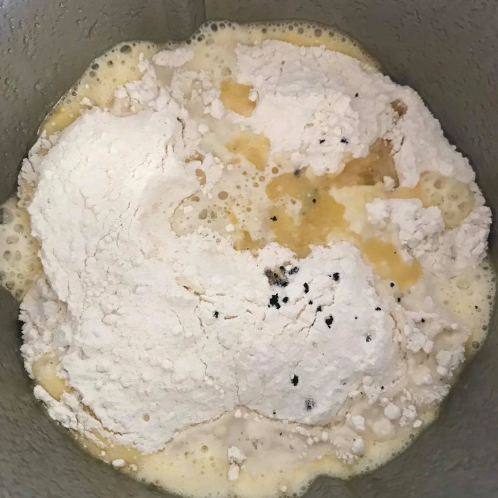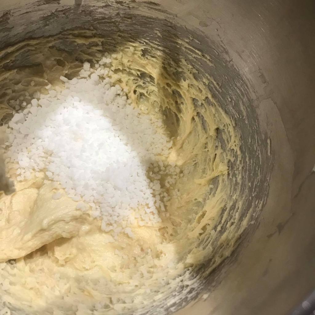 Ensuite, dégazez (faites retomber les gaz en appuyant dessus) et versez les 65 g de sucre perlé (c’est le sucre que l’on trouve sur les chouquettes). Mélangez.