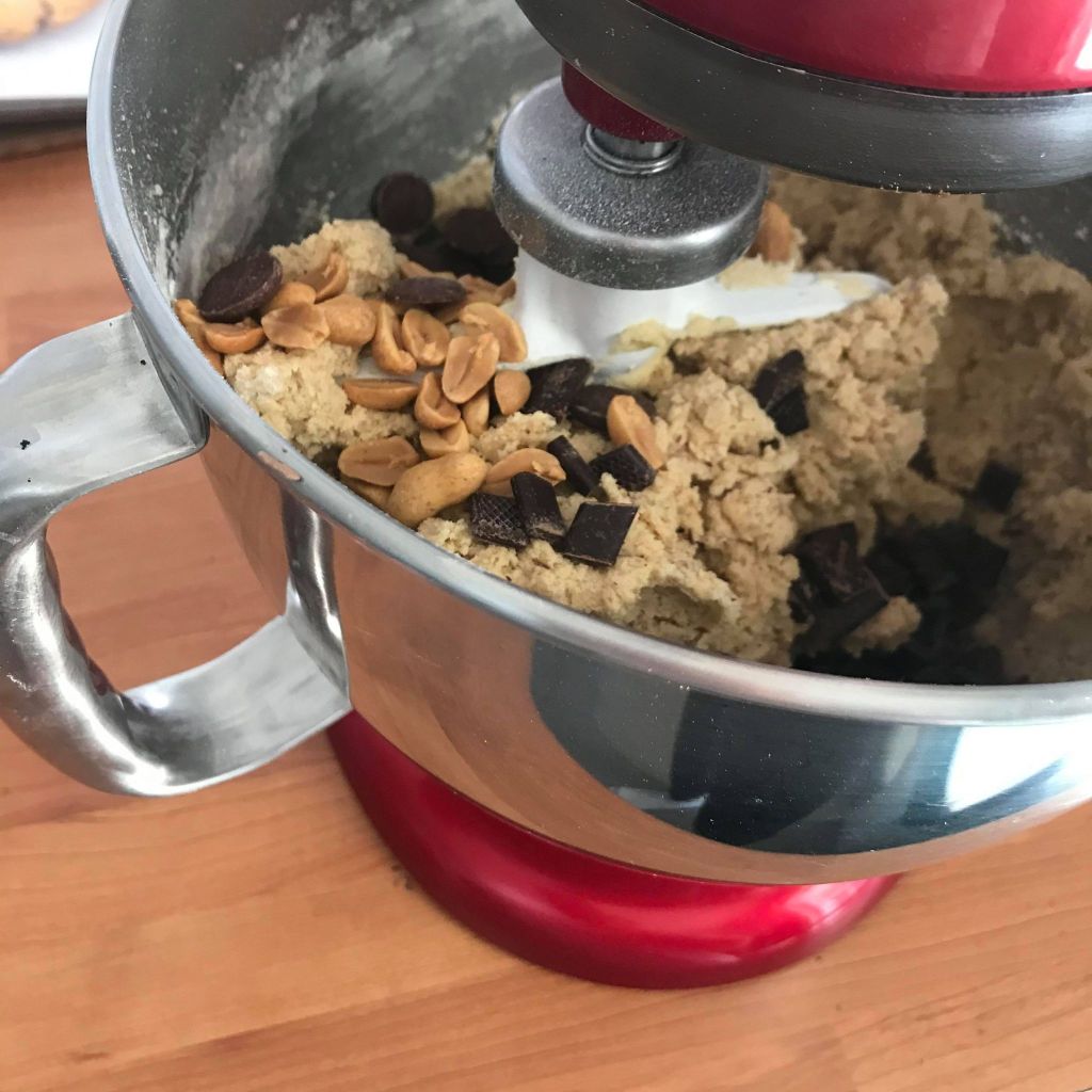 Lorsque la farine est presque incorporée rajoutez les 210 g de chocolat au lait cassés en morceaux et les 60 g de cacahuète.