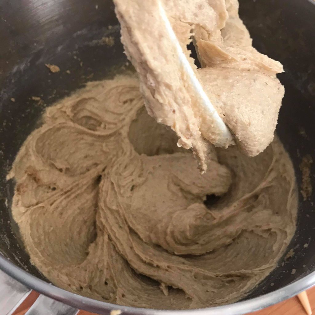 Commencez par mélanger les 110 g de beurre pommade et les 110 g de beurre de cacahuète avec les 280 g de vergeoise et les 130 g de sucre en poudre. Mélangez jusqu’à ce que le mélange blanchisse et soit bien crémeux.