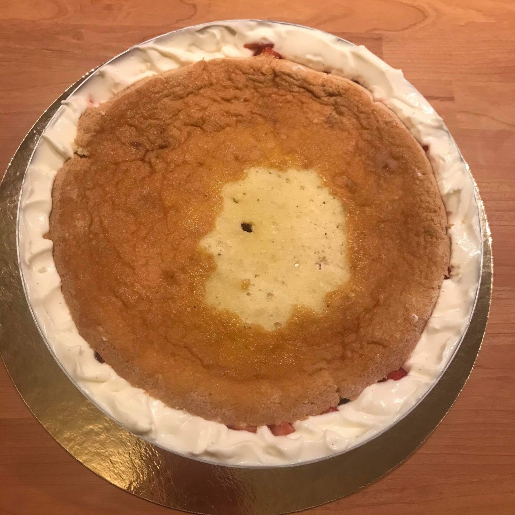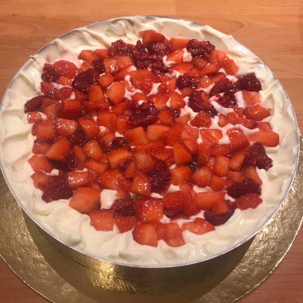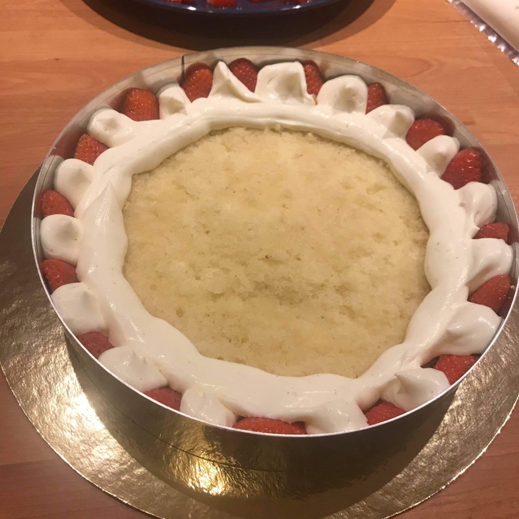 Une génoise avec une crème légère à la vanille et des fraises fraîches. Simple mais tellement bon.