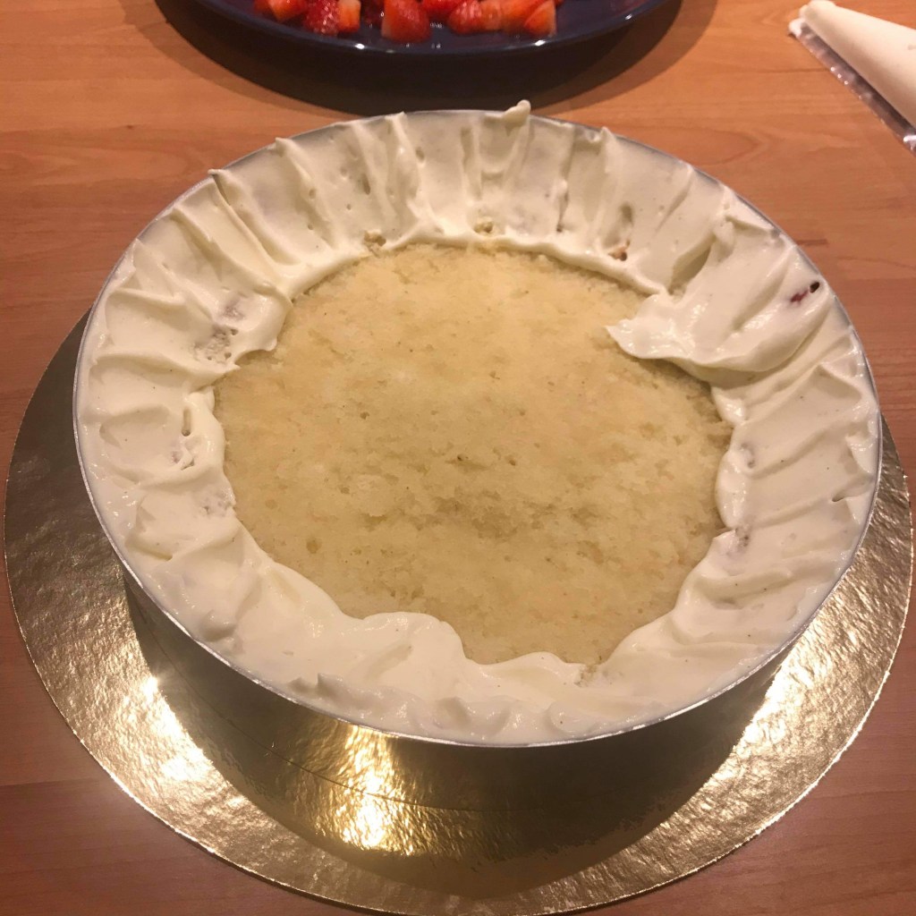 Déposez des morceaux de fraises et recouvrez du reste de crème et si vous avez de la place insérez un dernier disque de génoise.