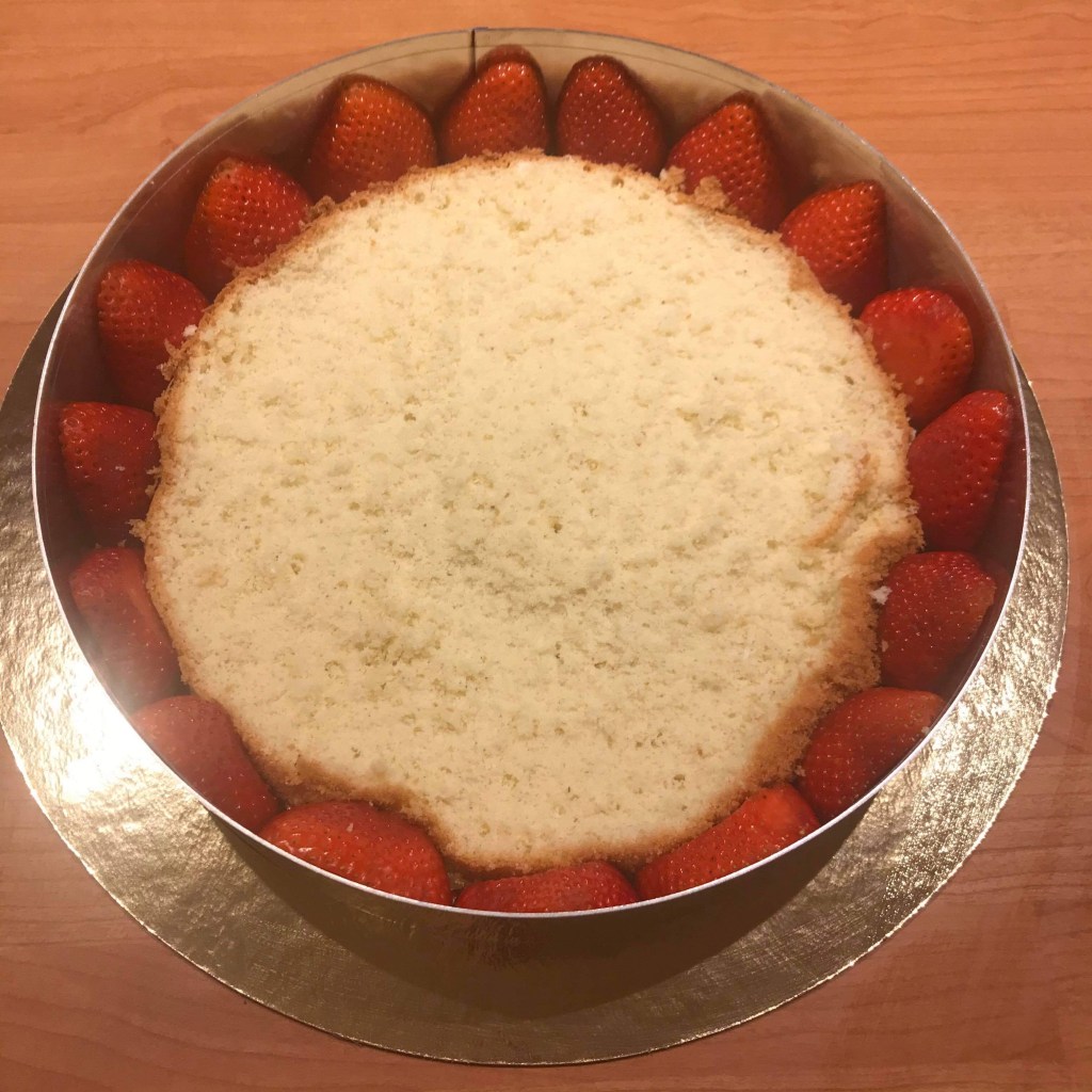 Ensuite, découpez des fraises en deux et faites le tour du cercle. Les fraises doivent être coincées entre le cercle et le disque de génoise.