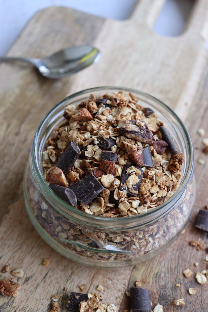 Le Granola nous vient tout droit des Etats-unis et il existe depuis 150 ans. C’est la star des petits déjeuners Healthy qui prônent une alimentation saine. Pour être plus claire c’est un mélange de céréales auxquels on rajoute des fruits secs ou à coque avec de l’huile et du miel ou un sirop pour lier le tout et qui est cuit au four. Si vous voulez en savoir plus sur le granola je vous invite à lire cette article que vous trouverez ici.