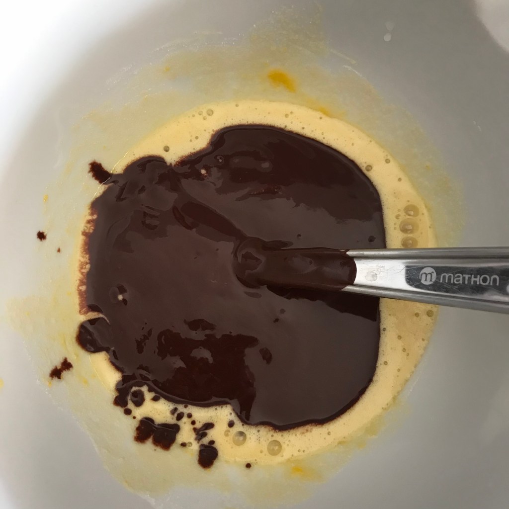 Récupérez le mélange beurre et chocolat fondu et mélangez.