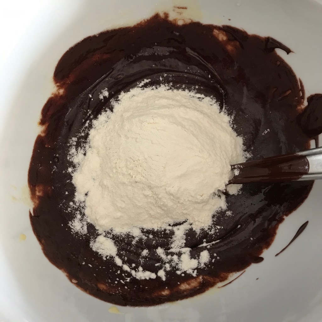 Enfin, ajoutez les 50 g de farine avec les 6 g de levure, la pincée de fleur de sel et les 90 g de pépites de chocolat. Mélangez.