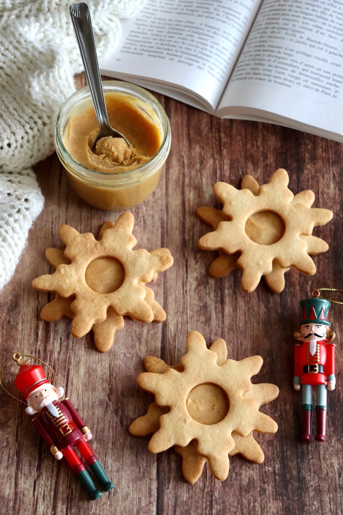 Prenez un sablé qui n’est pas troué et déposez un peu de caramel au centre.