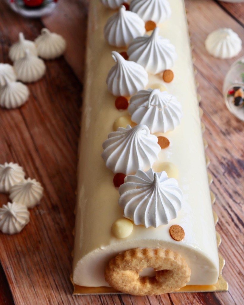 Décorez votre bûche avec par exemple des meringues ou ce qui vous fait envie.