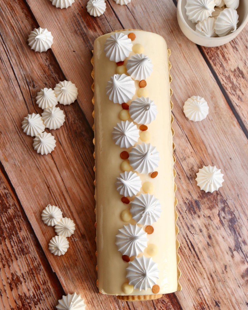 Enfin, j’ai utilisé un glaçage au chocolat blanc et des meringues pour la décoration. Elle ont aussi pour but d’apporter du craquant.