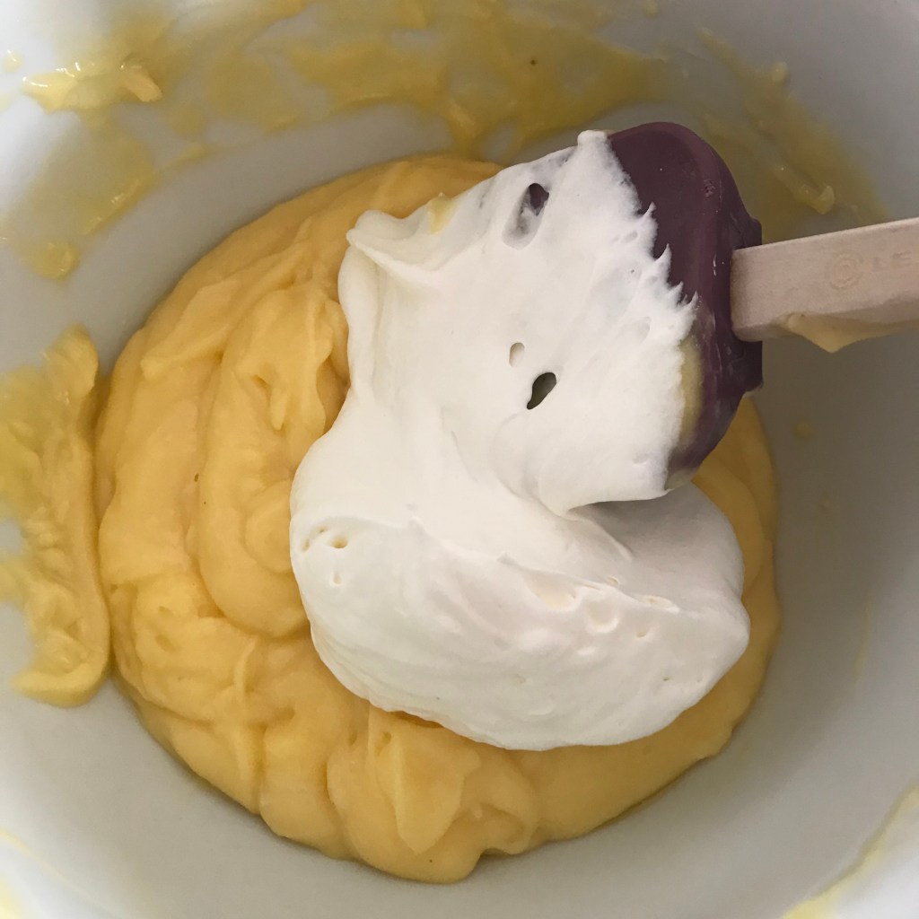 Prenez une petite quantité de la crème fouettée et mélangez-la vivement au curd. Le but est de permettre au deux préparations de s’unifier pour un meilleur mélange par la suite.