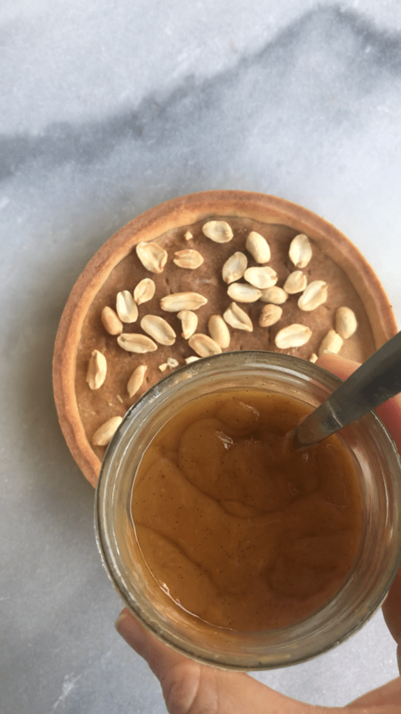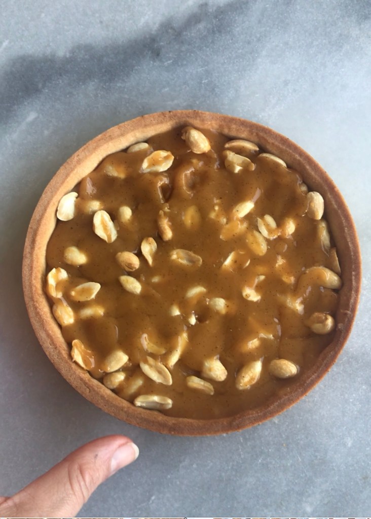 Et comme j’avais envie d’une tarte qui ne soit pas que dans la douceur, j’ai rajouté des cacahuètes non salées pour le croquant.