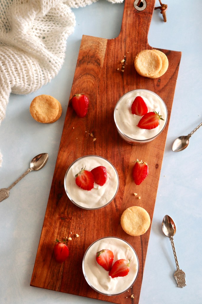Si cette recette de verrines est très rapide, il faudra tout de même penser à mettre au frigo la veille votre crème liquide entière. Attention pas de crème allégée car elle ne montera pas. Ici c’est la crème qui apportera la légèreté et le tenue à ce dessert.